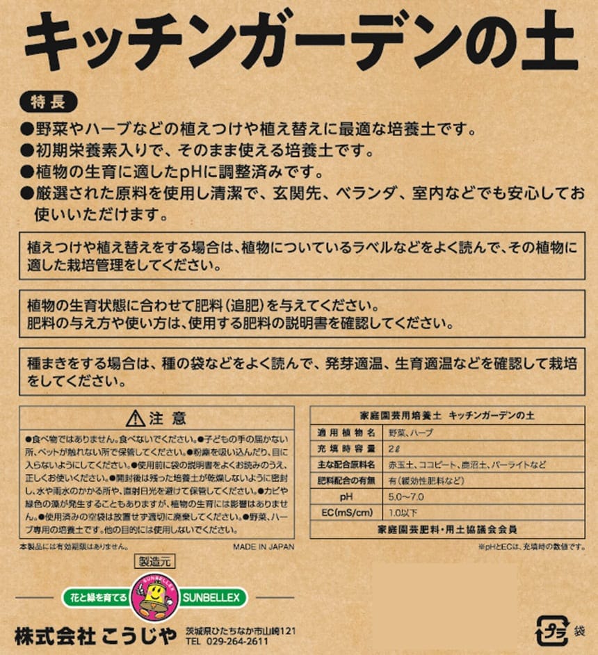 [3袋]こうじや SUNBELLEX 微粉ハイポネックス+マグァンプK配合 キッチンガーデンの土 2L | 野菜やハーブなどの植え付けや植え替えに最適な培養土です。