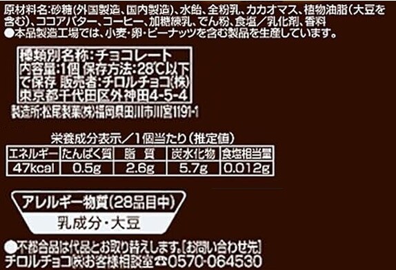 コーヒーの苦みとチョコレートの甘味、ヌガーの食感がクセになる懐かしい味わいです。