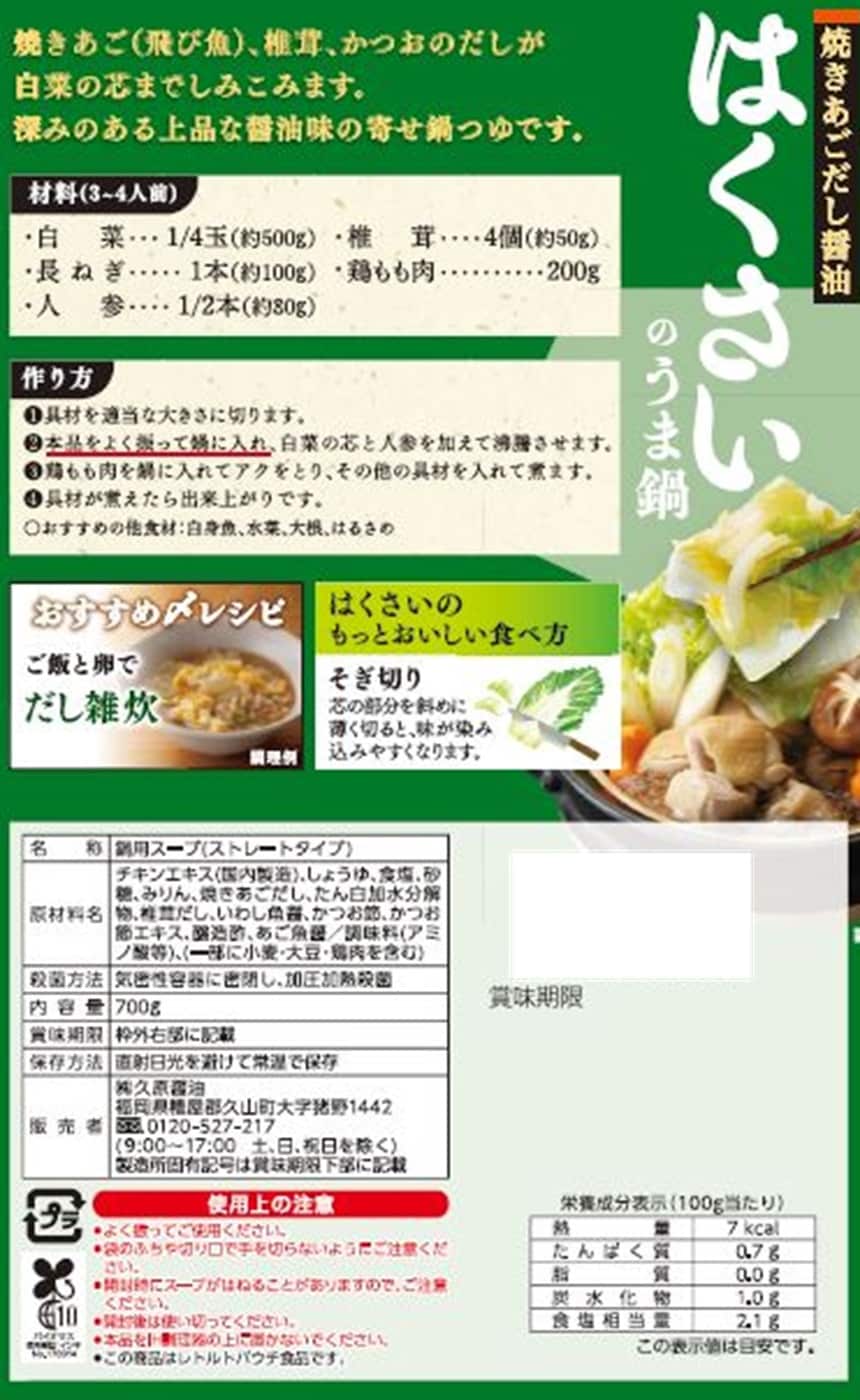 焼きあごだし(飛び魚)とかつおだしに、昆布の旨みを加えた寄せ鍋つゆです。
