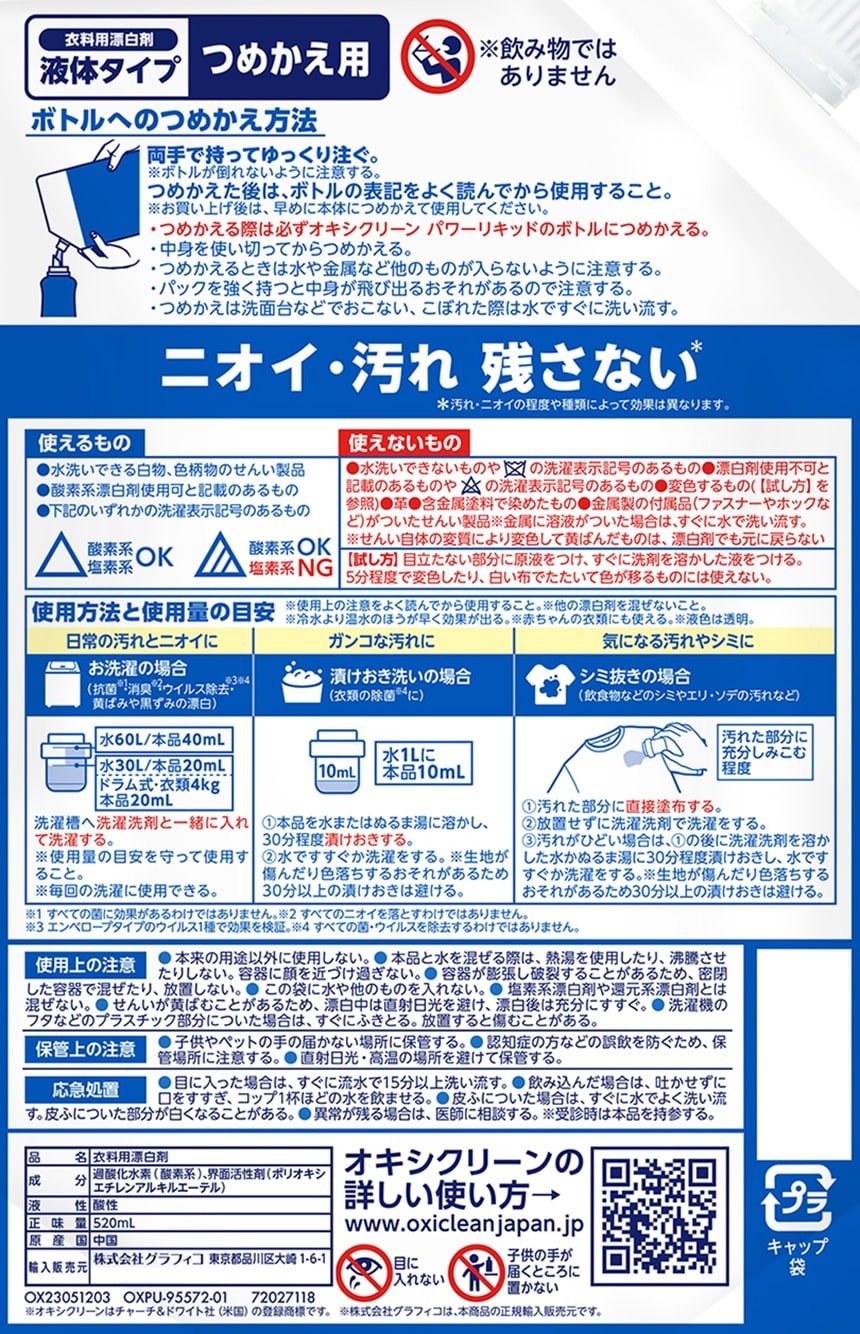 [6個]グラフィコ オキシクリーン パワーリキッド つめかえ用 520ml | いつものお洗濯にオキシクリーンのパワーを足す、オキシクリーンパワーリキッド。