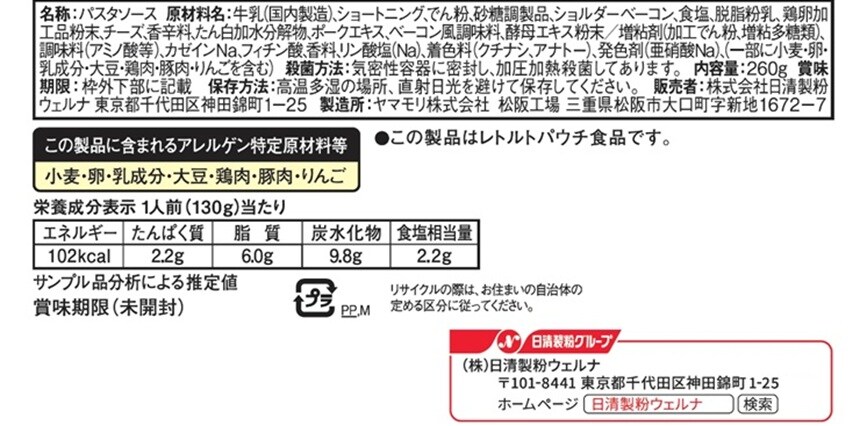 ・マ・マー ミルクたっぷりのカルボナーラ 260g×6個 - 賞味期限