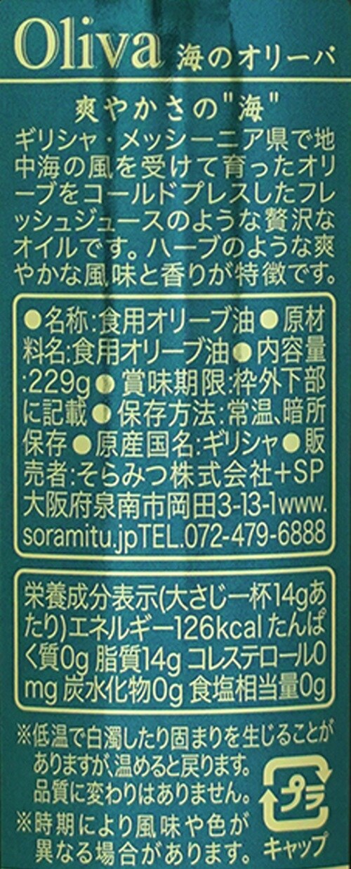 一般のオリーブオイルは様々な地域のもののブレンド品で苦味やエグ味が強いものが多いです。そらみつ 海のオリーバは、ギリシャ・メッシーニア州のオリーブの実だけをコールドプレスした産地限定のエクストラバージンオリーブオイルです。産地限定のオリーブの実を27℃以下の温度で物理的に圧搾しただけ(コールドプレス)なので、フレッシュジュースのようなオリーブそのものの美味しさを実感いただけます。パスタや炒め物だけでなくサラダやパン、冷奴、お刺身等に生でそのままお使いいただきオリーブそのものの風味を味わっていただけます。