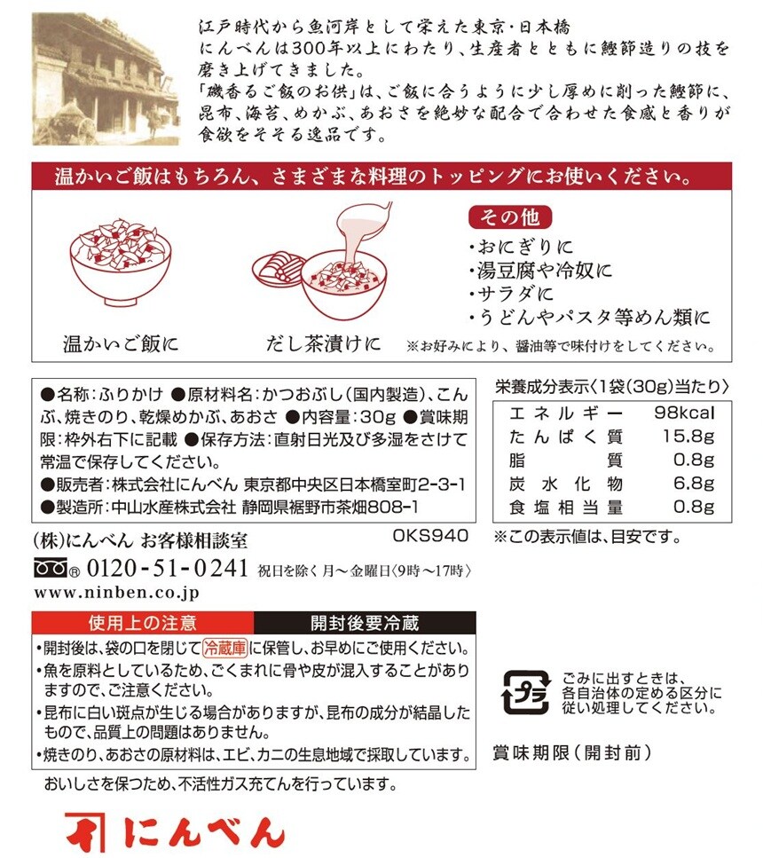[15袋]にんべん 磯香るご飯のお供 30g | ご飯に合うように少し厚めに削った鰹節に、昆布、海苔、めかぶ、あおさを絶妙な配合で合わせた食感と香りが食欲をそそる逸品です。