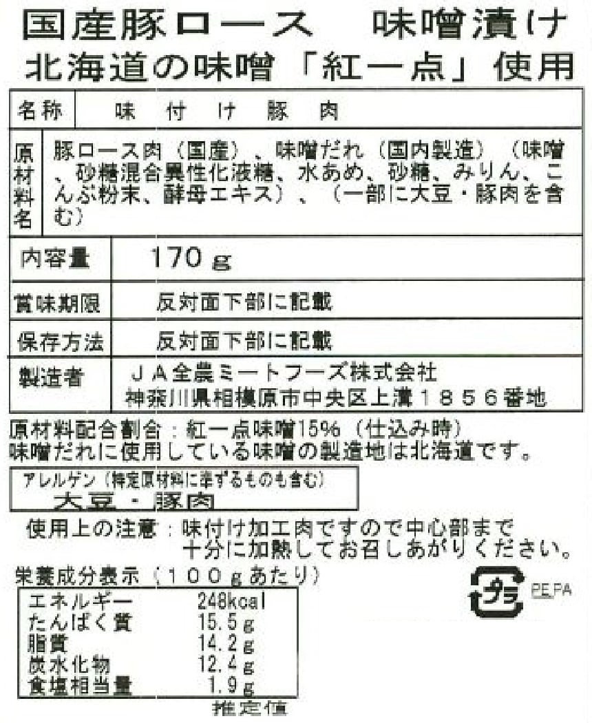 [20袋]JA全農ミートフーズ 国産豚ロース味噌漬け 北海道の味噌「紅一点」使用 170g | 2種類の味噌をブレンド 甘さと塩加減の丁度良いあんばい