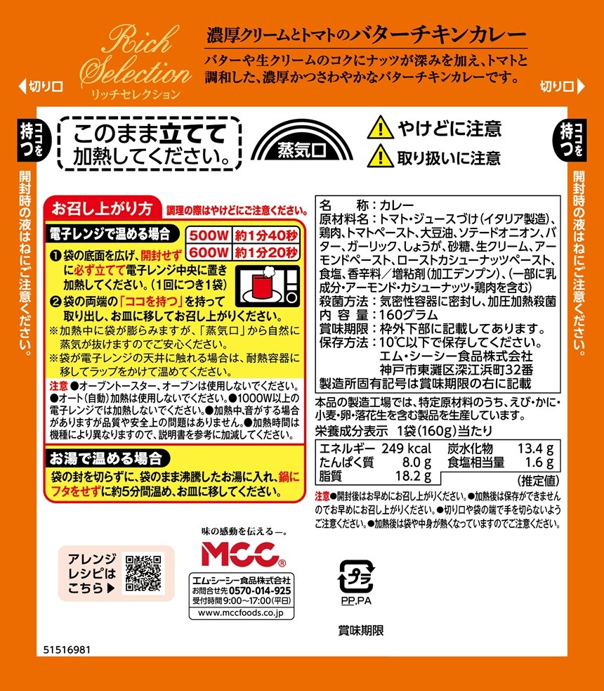 - ・濃厚クリームとトマトのバターチキンカレー 160g×8袋