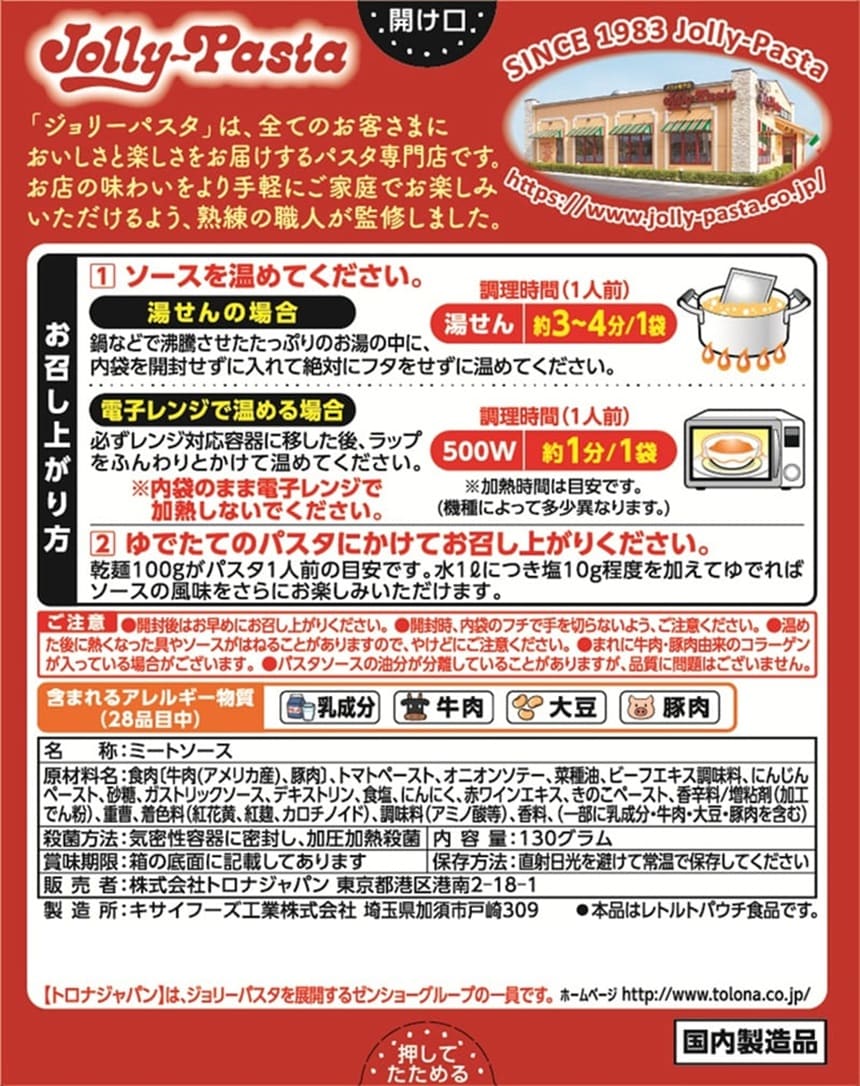 [30箱]トロナジャパン ジョリーパスタ監修 ボロネーゼ 130g | パスタ専門店ジョリーパスタ監修のパスタソースです。