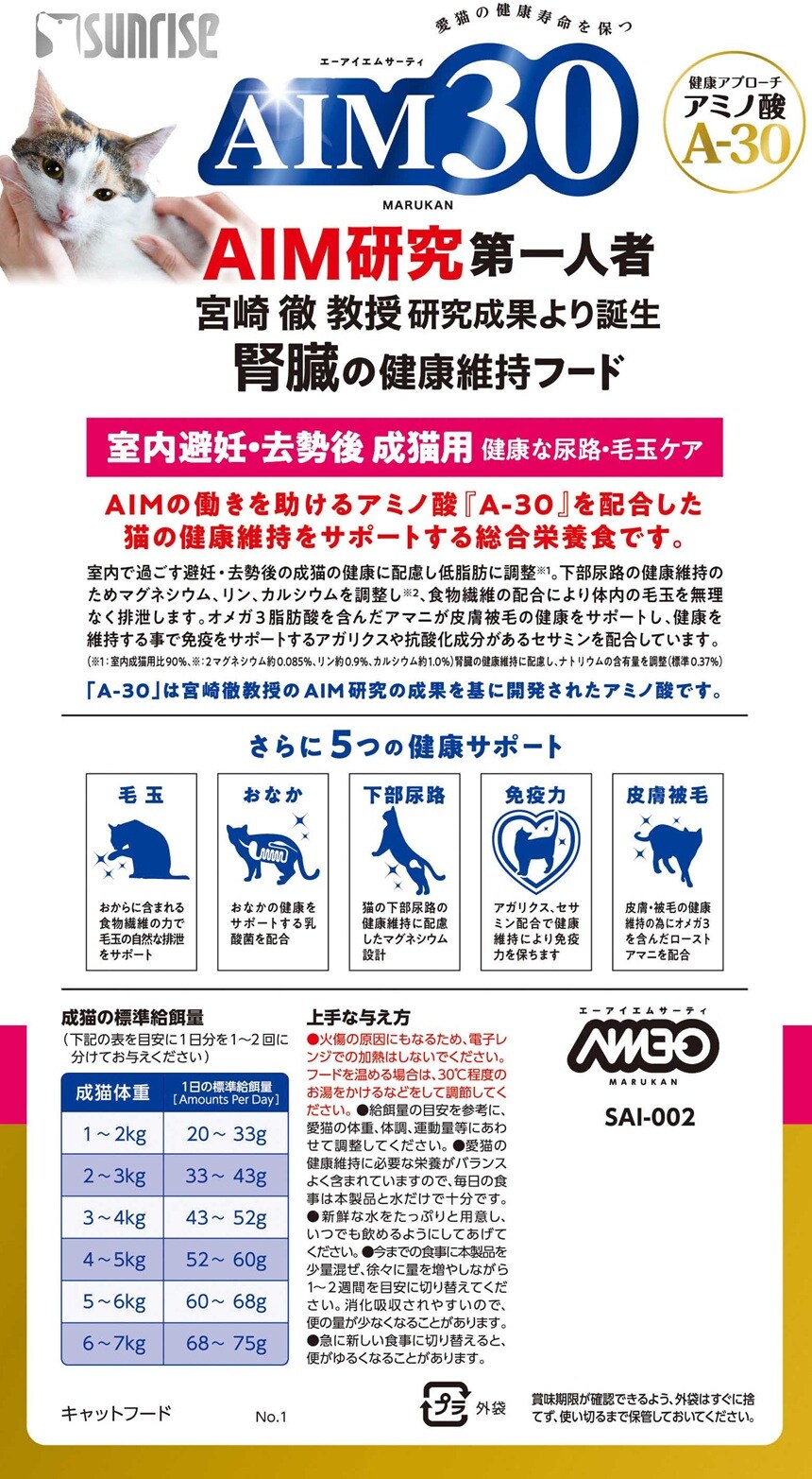 AIMの働きを助けるアミノ酸「A-30」*1を配合した猫の健康維持をサポートする総合栄養食です。