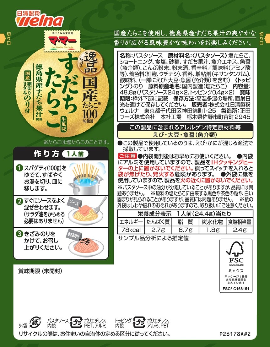 [20個]日清製粉ウェルナ ママー あえるだけパスタソース すだちたらこ 48.8g | 国産たらこを使用し、徳島県産すだち果汁の爽やかな香りが広がる風味豊かな味わいをお楽しみください。