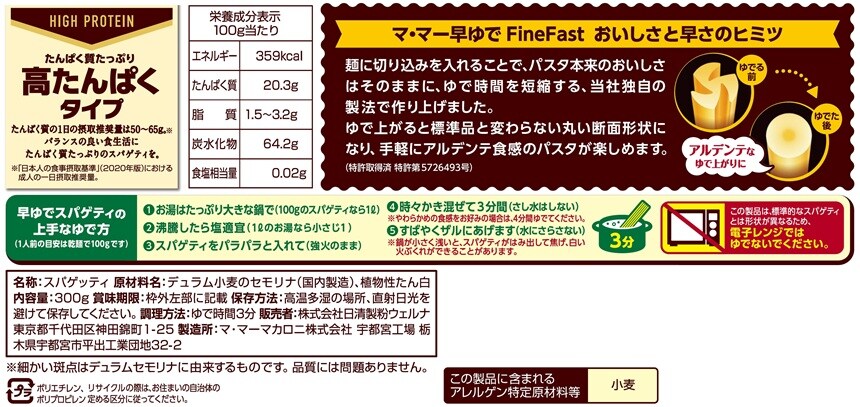 - ママー 早ゆで3分スパ 高たんぱく1.6mm 300g
