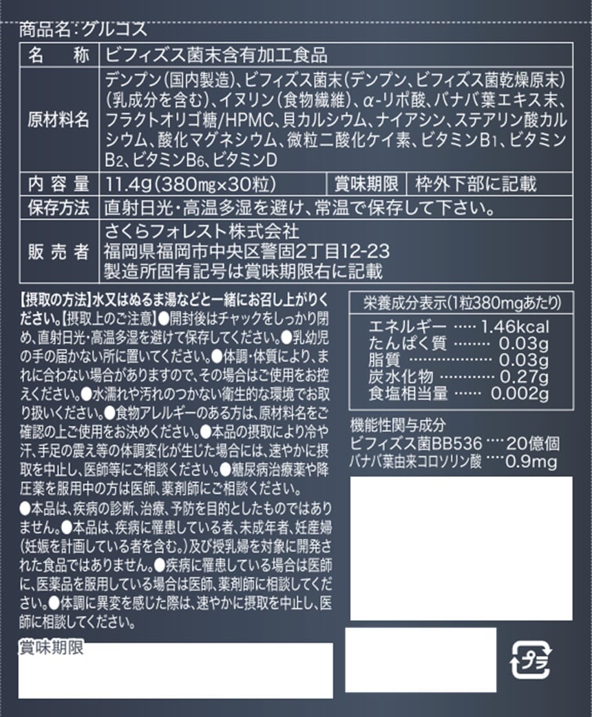 ビフィズス菌BB536:20億個、バナバ葉由来コロソリン酸:0.9mg
