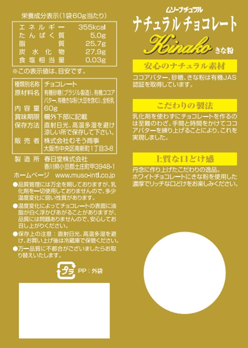 [20個]むそう商事 ナチュラルチョコレート きなこ 60g | 香り豊かな有機きな粉を使い、口の中でとろけるリッチな味わいのきな粉チョコレート。