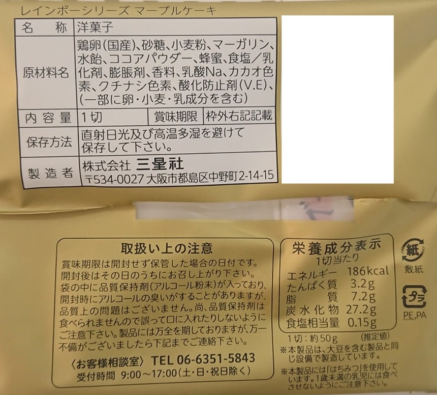 [30個]三星社 レインボーシリーズ マーブルケーキ 1切(50g) | カステラ生地にマーガリンとココアを使用したマーブル模様のケーキ