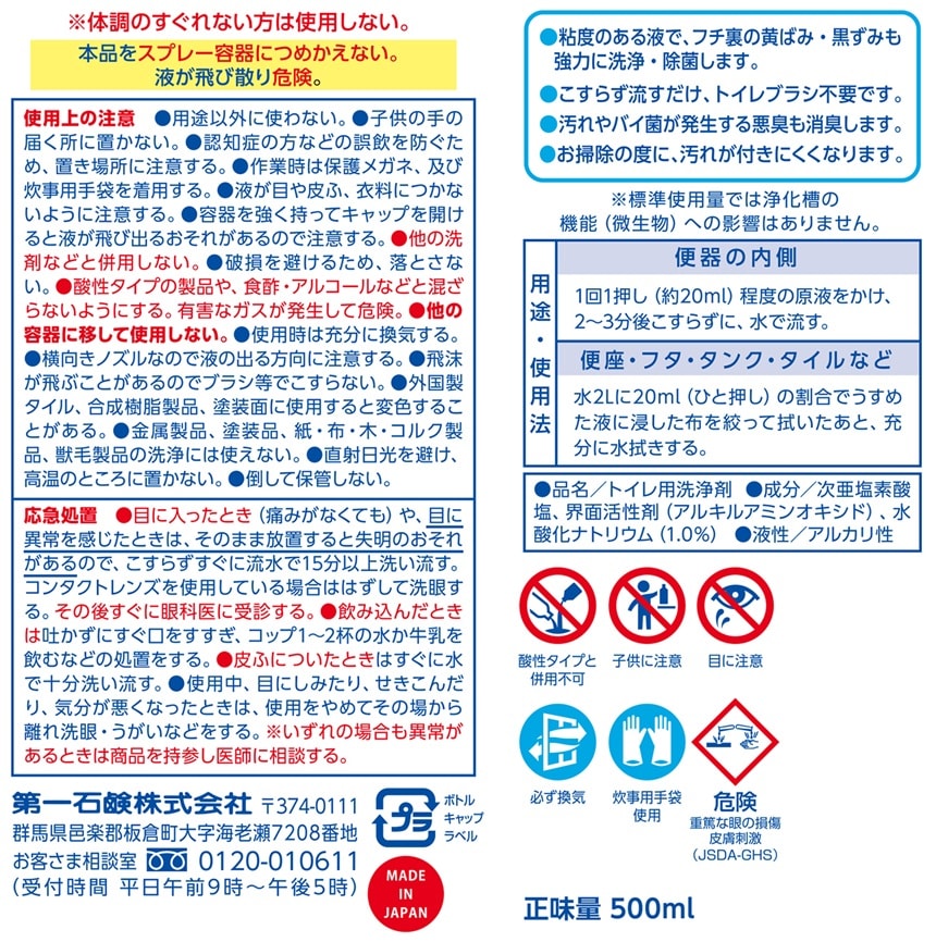 ※まぜるな危険(酸性タイプの製品と一緒に使うと有害な塩素ガスが出て危険