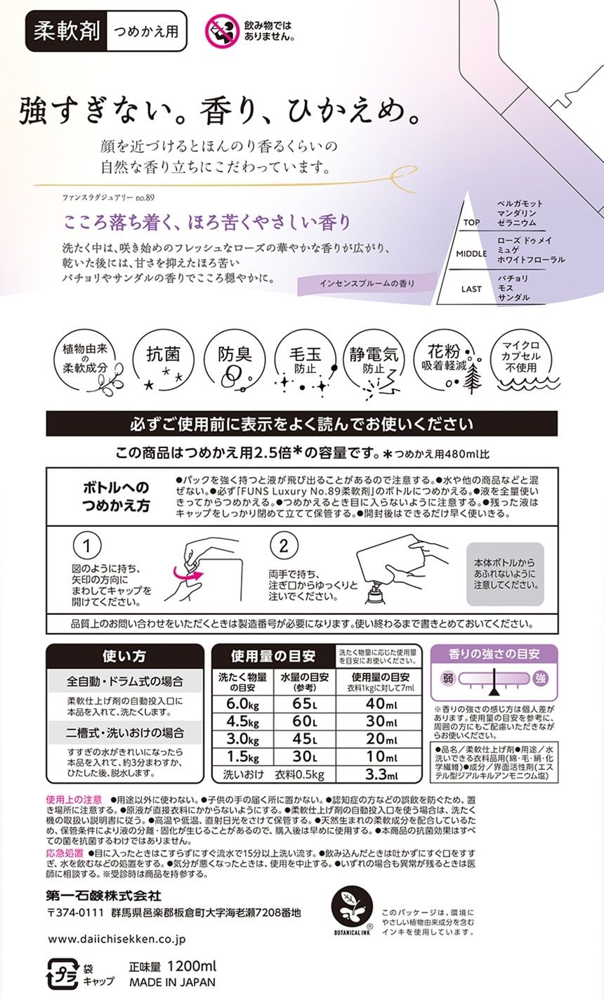 [8個]第一石鹸 FUNSラグジュアリー 柔軟剤 No.89 大容量詰替 1200ml | 「強すぎず自然な香り立ち」の柔軟剤