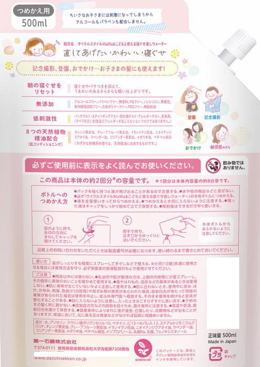 [10個]第一石鹸 サイクルスタイル MaMa& こどもと使える寝ぐせ直しウォーター 詰替用 500ml | 朝の寝ぐせをリセット