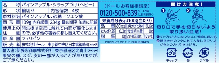 甘さと酸味のバランスの取れたフィリピン産ドールパインをしっかりした甘さのヘビーシロップに漬けました。