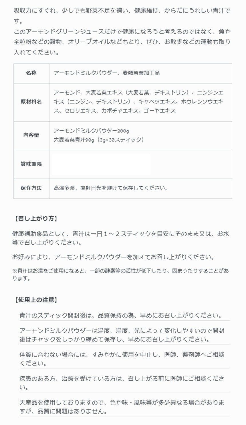 これは、成人病に良いアーモンドと栄養不足を補う青汁を同時にとれる商品です。