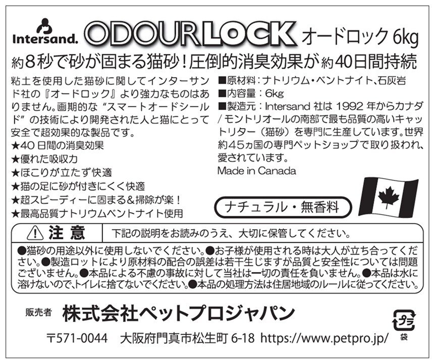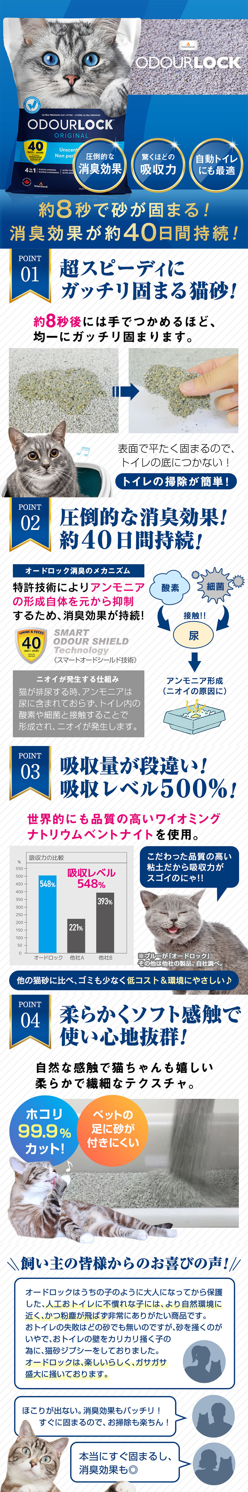 ・粘土を使用した猫砂に関してインターサンドR社の『オードロック』より強力なものはありません。『オードロック』は画期的な“スマートオードシールド”の技術により開発された人とネコにとって安全で超効果的な製品です。