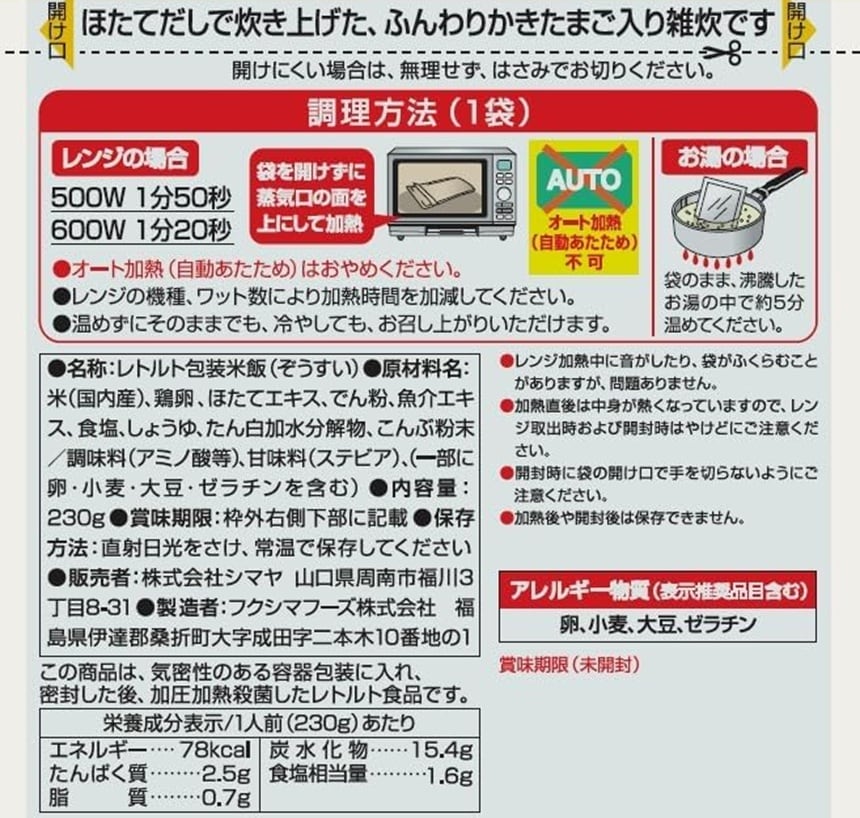 - ・昔ながらの雑炊 ほたてだし仕立て レトルト 230g×5食