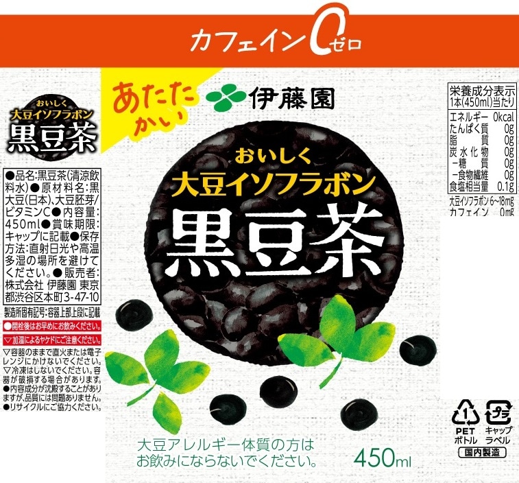 大豆イソフラボンを6~18mg(1本=450ml当たり)含んだカフェインゼロの黒豆茶飲料です。