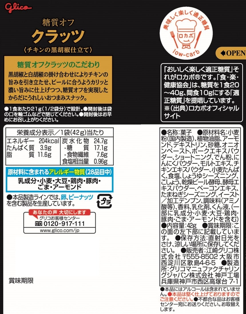 [72個]江崎グリコ 糖質オフクラッツ<チキンの黒胡椒仕立て> 42g | 旨みはじけるおつまみスナック。濃い旨みで糖質オフ。
