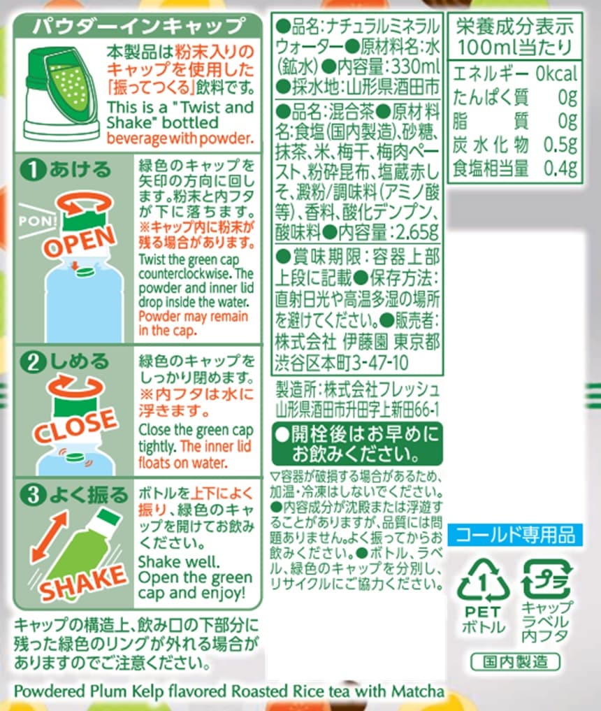 抹茶・米・梅・昆布の縁起のよい国産4種をブレンドした酸味と旨味と酸味が特長の、振って作る旨酸っぱい新感覚のお茶です。