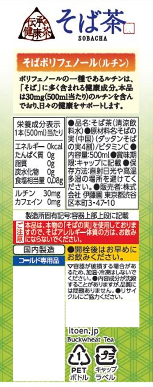 そばの実に含まれるポリフェノールの一種である健康成分“ルチン”を30mg(500ml製品1本当たり)含んだ、そば茶飲料です(カフェインゼロ)。