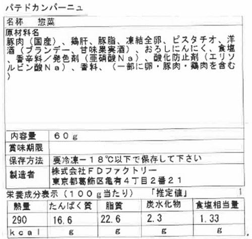 パテドカンパーニュとはフランス語で「田舎風パテ」という意味で日本人向けに食べやすい味付けにしております。