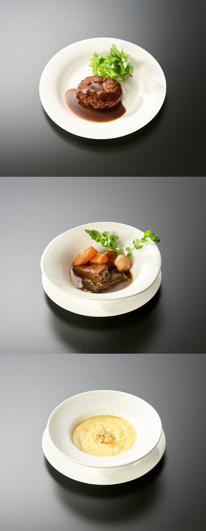 - [冷凍]【3種計6個】銀座ポルトファーロ監修セット(デミグラスハンバーグ/牛ホホ肉シチュー/コーンポタージュ)