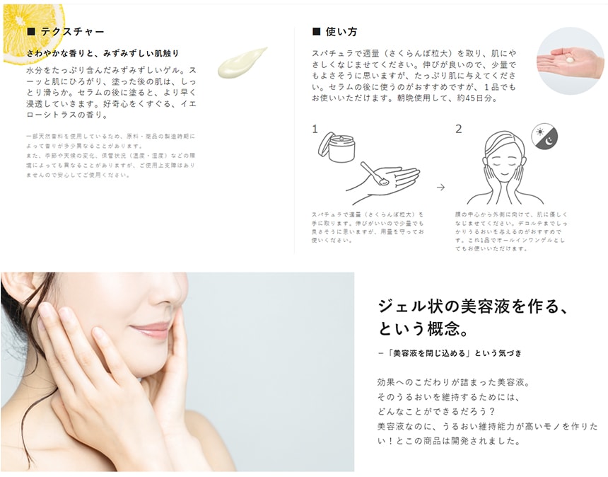 スパチュラで適量(さくらんぼ粒大)を取り、肌にやさしくなじませてください。伸びが良いので、少量でもよさそうに思いますが、たっぷり肌に与えてください。セラムの後に使うのがおすすめですが、1品でもお使いいただけます。