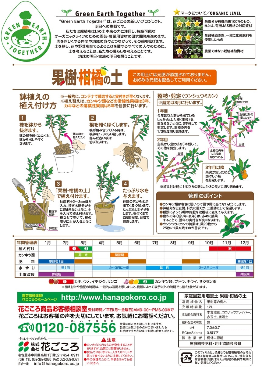 - 花ごころ GREEN EARTH TOGETHER 果樹・柑橘の土 培養土 12L
