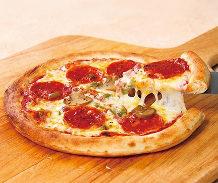 ペパロニ、ベーコン、マッシュルーム、黒こしょうをトッピングした王道のミックスピザ