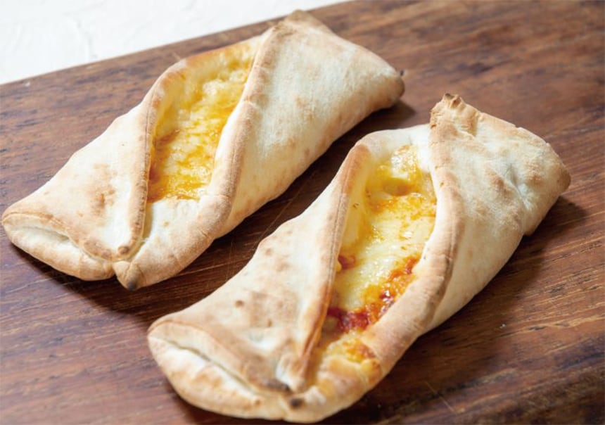 発酵種を使用した生地にトマトソース、チーズ、オレガノをトッピングしたワンハンドピザです。