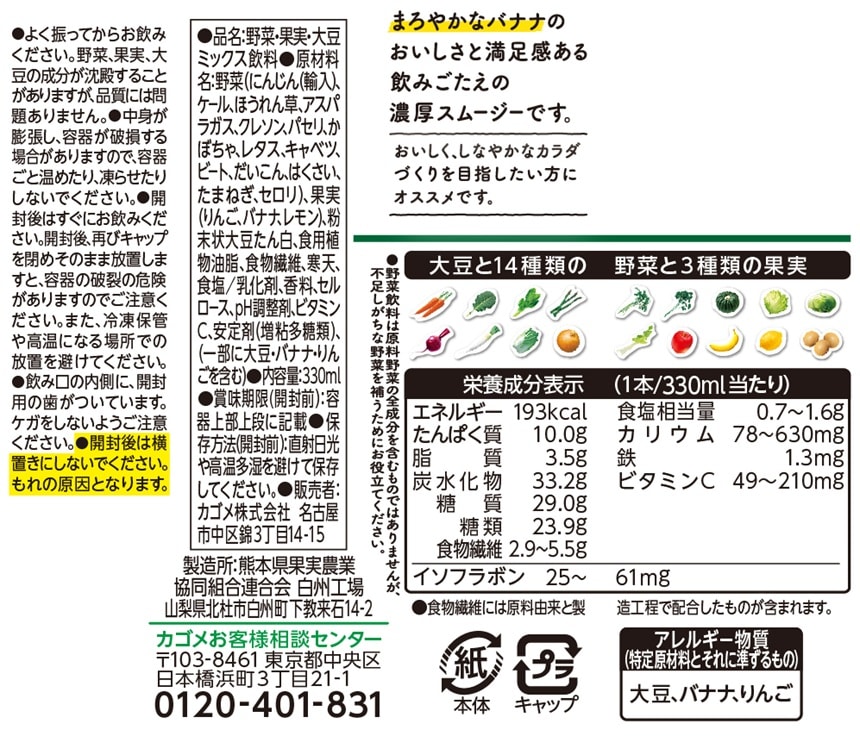 [48本]カゴメ 野菜生活100Smoothie SOY PROTEIN バナナ 330ml | しなやかなカラダづくりに関心がある方を優しく応援するSOY PROTEINスムージーです。