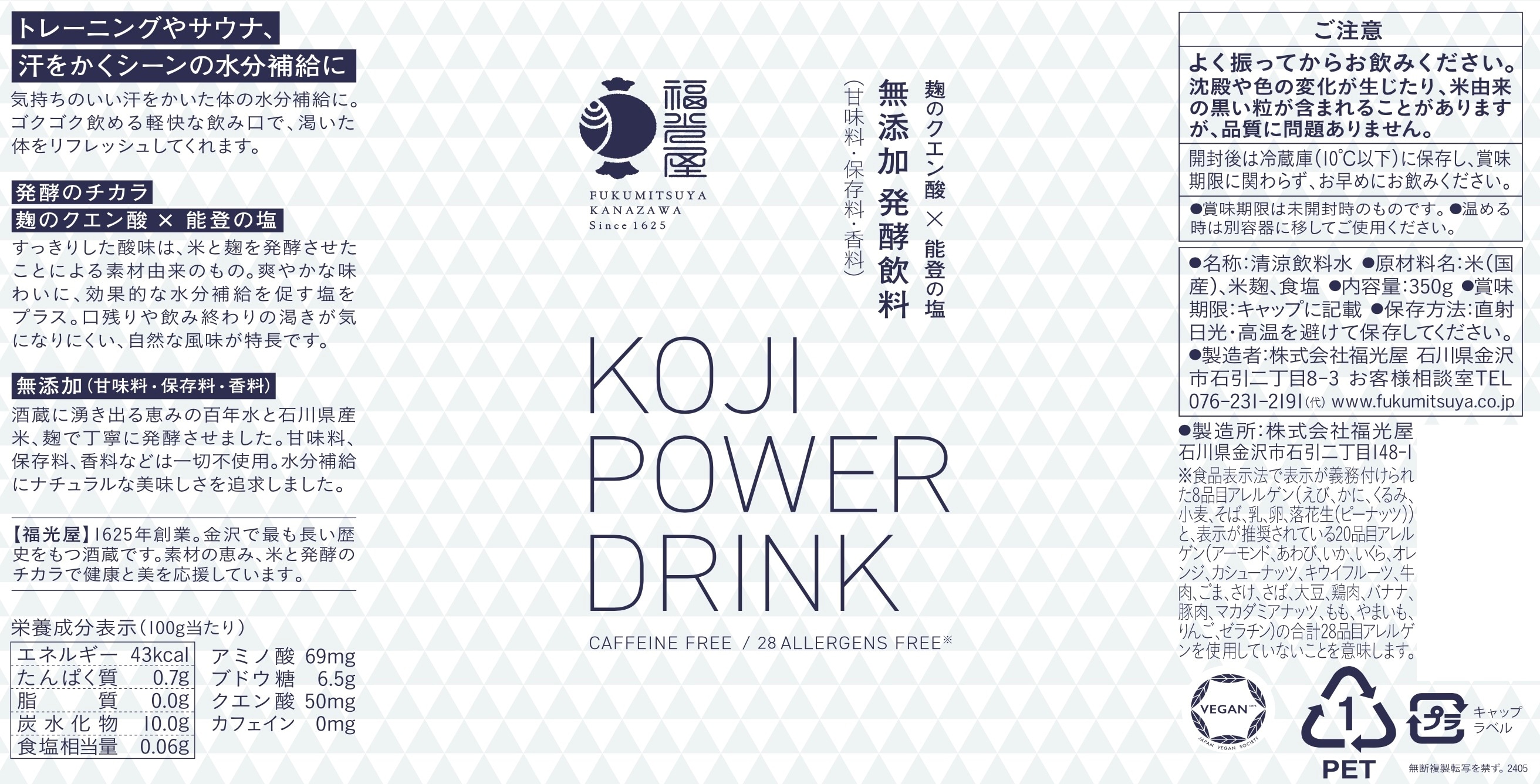 「KOJI POWER DRINK」は、霊峰白山の麓より百年以上の時をかけて酒蔵に湧き出る恵みの「百年水」と、厳選した国産米を、福光屋独自の技術を生かして作った軽快で爽やかな味わいの発酵飲料です。