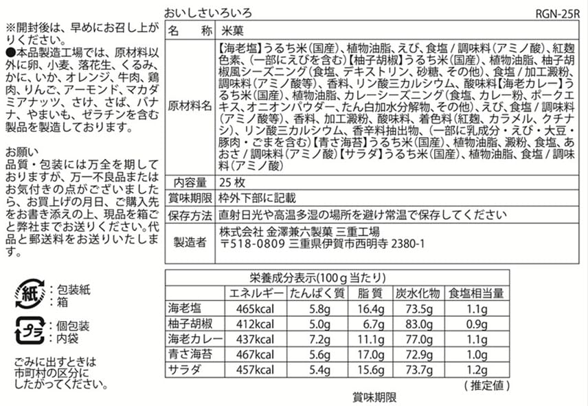 [5箱]金澤兼六製菓 おいしさいろいろ RGN-25R 25枚 | 国産米にこだわりおもてなしの心を添えて丁寧に焼き上げた一品です