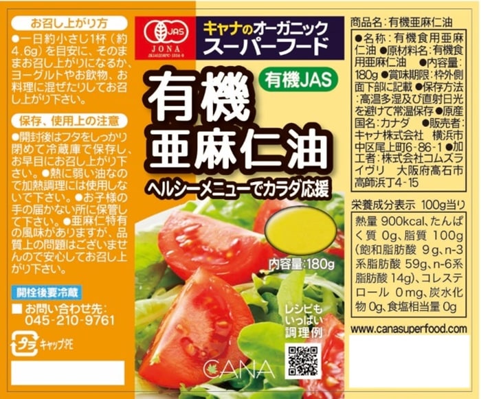 [10本]キャナ 有機亜麻仁油 180g | カナダで有機栽培された亜麻の種子を低温圧搾した有機亜麻仁油
