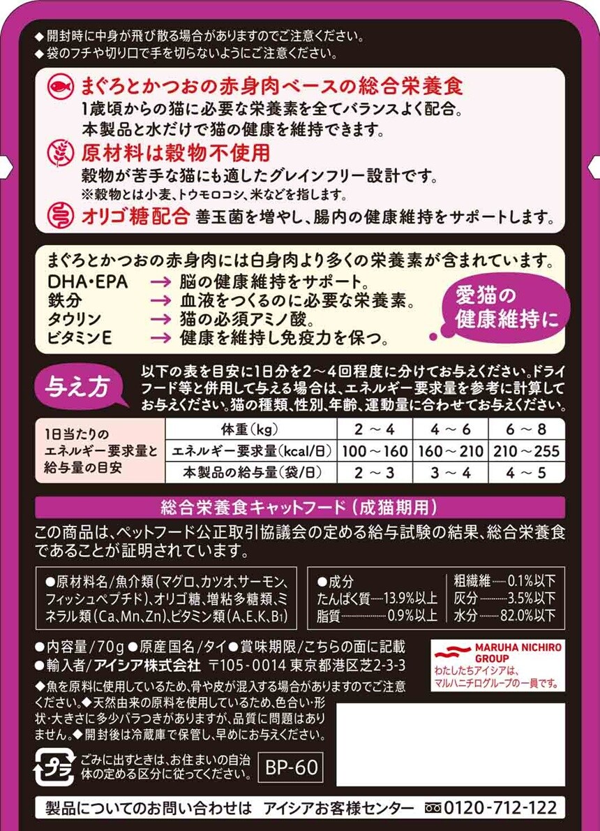 ・DHA、EPA、鉄分、タウリン、ビタミンEを含むまぐろとかつおの赤身肉ベースの総合栄養食です。