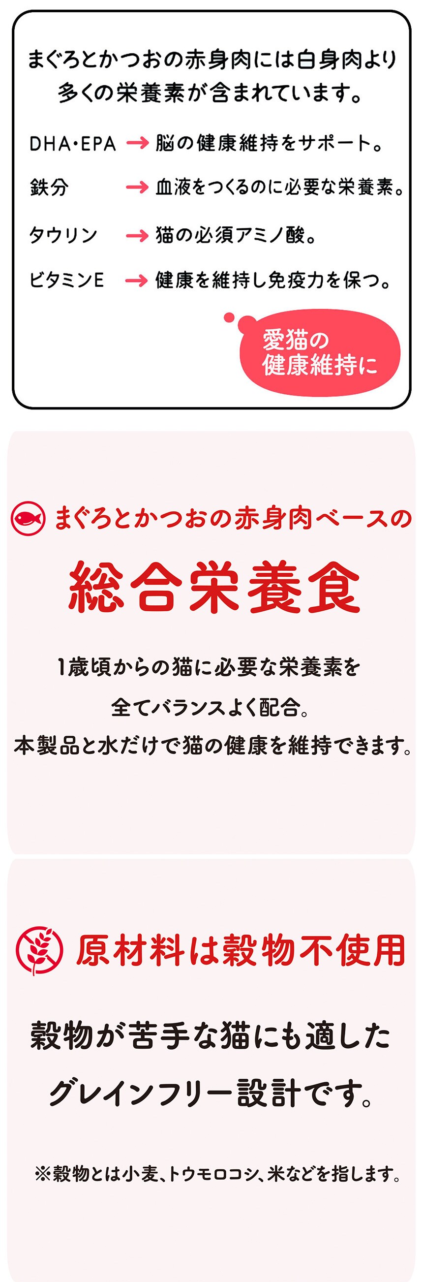 ・DHA、EPA、鉄分、タウリン、ビタミンEを含むまぐろとかつおの赤身肉ベースの総合栄養食です。