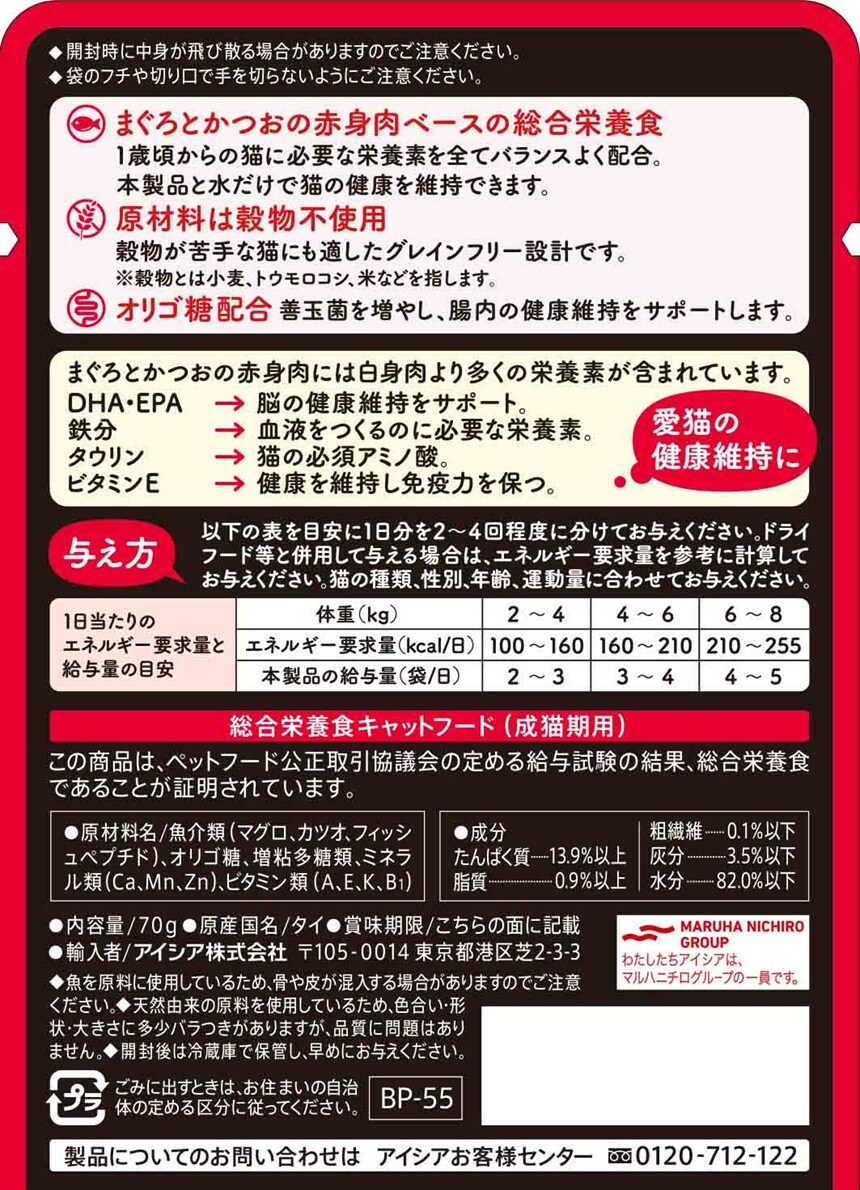 ・DHA、EPA、鉄分、タウリン、ビタミンEを含むまぐろとかつおの赤身肉ベースの総合栄養食です。