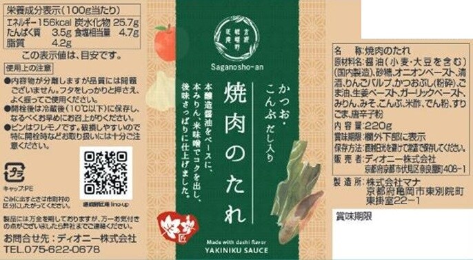[12本]ディオニー 嵯峨野匠庵 焼肉のたれ 220g | 本みりん・米みそがコクと肉の旨みを引き出し、りんご、しょうが、更に昆布・かつおだしを加えることによって後味さっぱりに仕上げました。