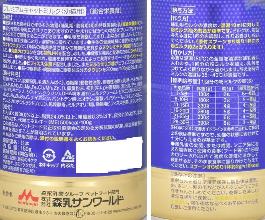 ・成分は猫の母乳に近づけてあり、生まれたばかりの幼猫をプレミアムキャットミルクだけで哺育することができます。