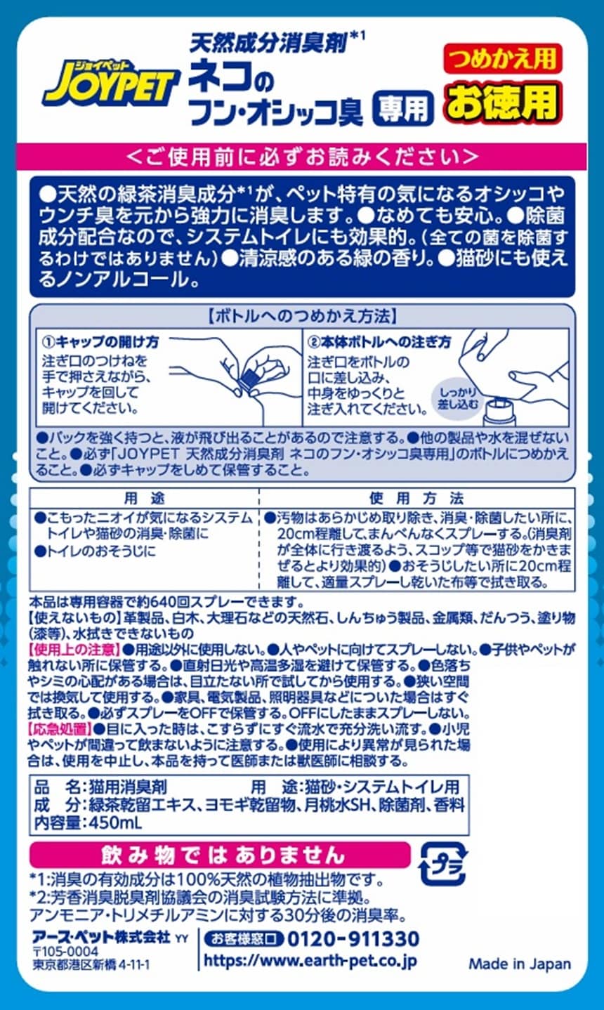 [24個]アース・ペット 天然成分消臭剤 ネコのフン・オシッコ臭専用 つめかえ用お徳用 450ml | ニオイの元から強力消臭・抗菌!