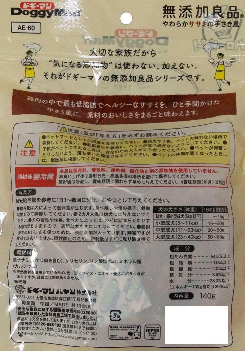 ・手でちぎれるほどの柔らかさなので、超小型犬、小型犬でも食べやすい大きさにすることができます。保存料、着色料、発色剤、酸化防止剤不使用。