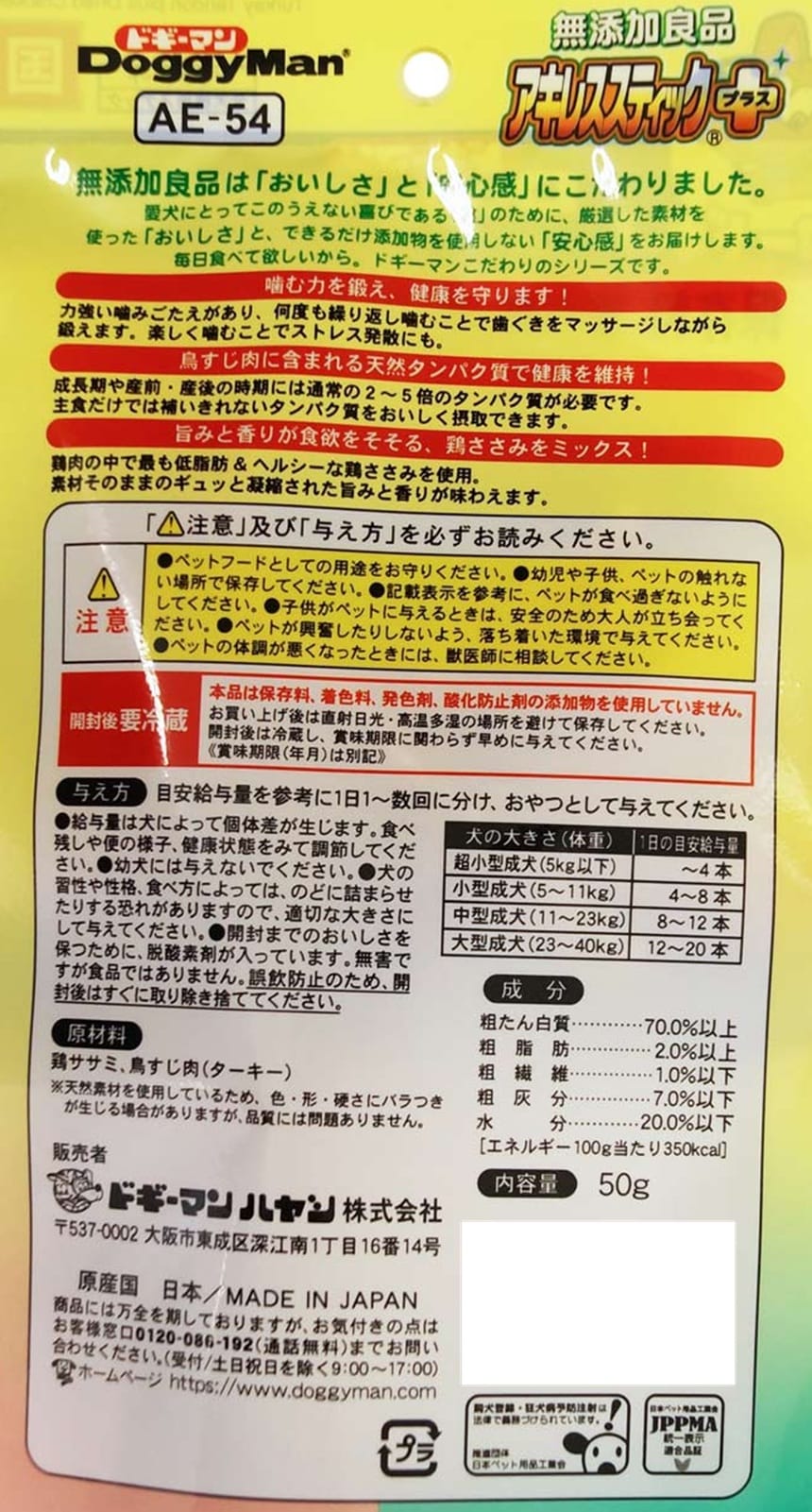 [36個]ドギーマンハヤシ 無添加良品 アキレススティック プラス 50g | 鳥すじ肉のガムスナックに粗切り鶏ささみをプラス!