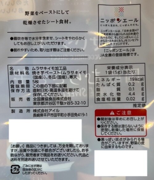 ・ニッポンエール 国産むらさき芋 やさいシート 5枚入×10袋