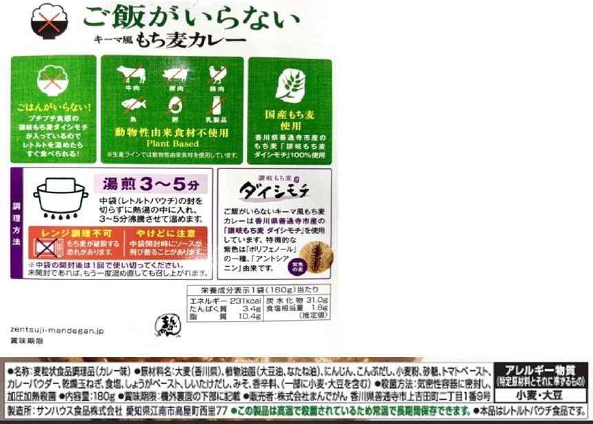 [20個]まんでがん ご飯がいらない キーマ風 もち麦カレー 甘口 180g | 全国的にほとんど流通していない幻のもち麦、香川県善通寺市産「讃岐もち麦ダイシモチ」を使用。