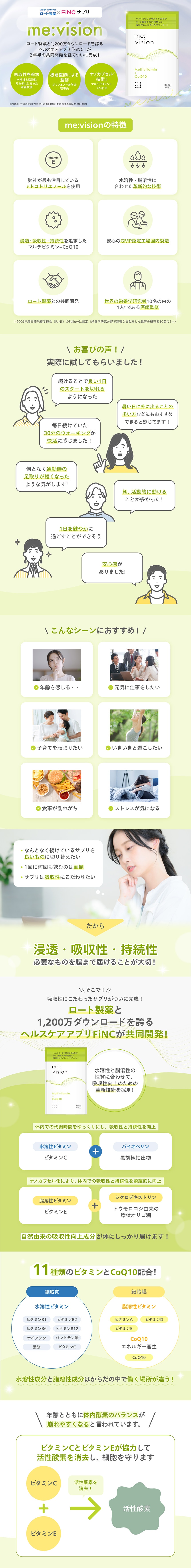 ロート製薬とヘルスケアアプリ「FiNC」が、共同開発をした吸収性・持続性を追求するマルチビタミン+CoQ10サプリメントです。