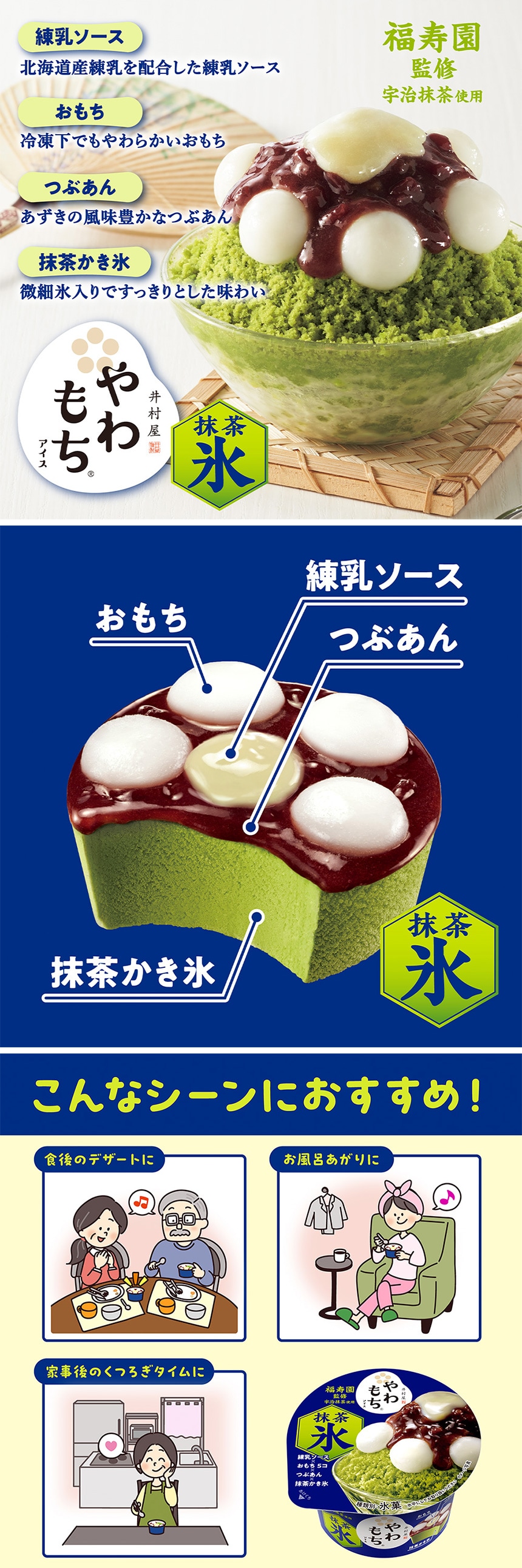 冷凍下でもやわらかいおもち、つぶあん、練乳ソース、抹茶かき氷が楽しめる、夏にぴったりな4層構造のすっきりとしたやわもちアイスです。