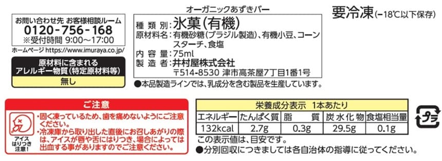 [冷凍]井村屋 オーガニックあずきバー 75ml×20個 | 有機原料を使用した原材料にこだわったあずきバーです
